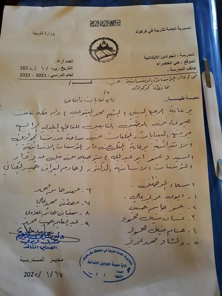 وجه مدير دار المؤسسات الإنسانية في محافظة كركوك حيدر الكناني، اليوم السبت، برفع النفايات وتصليح كبل كهرباء مقطع، لبعض مدارس المحافظة.