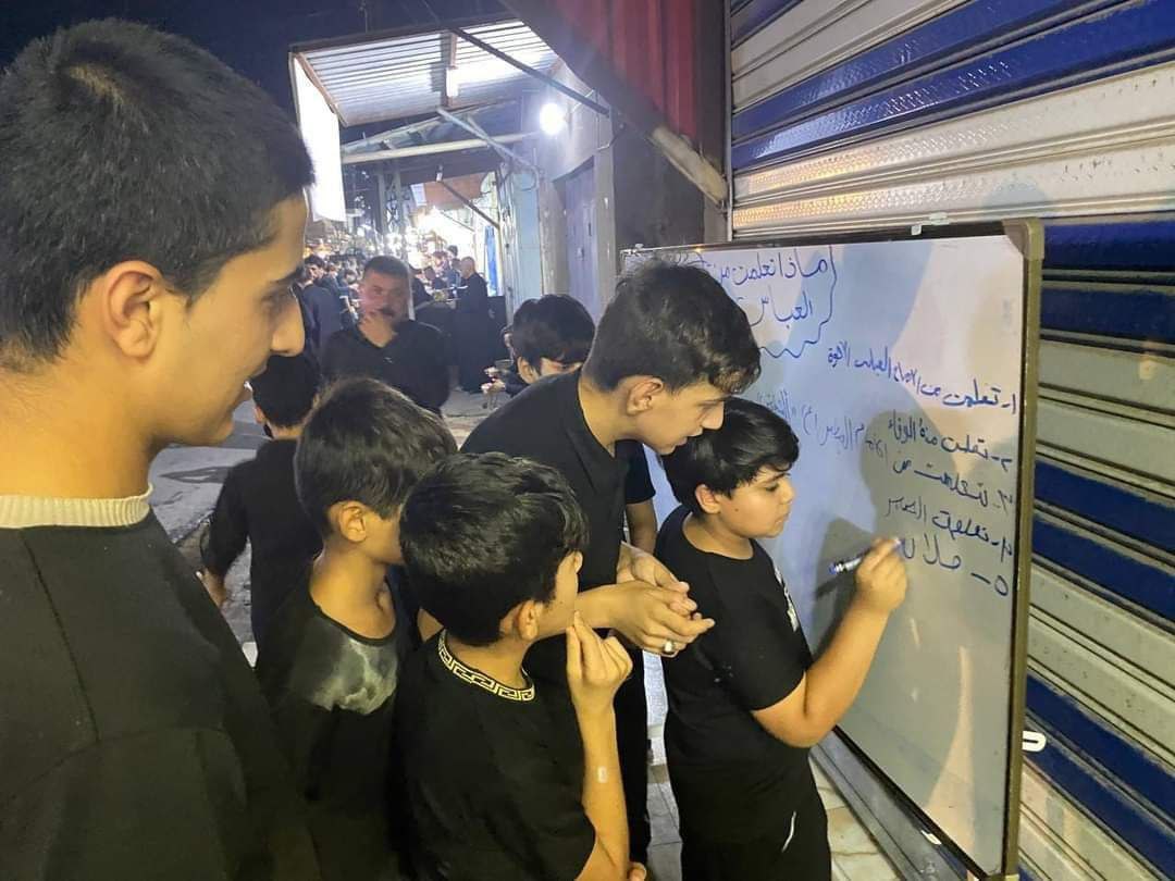 وتابع، “وتضمن العديد من الفقرات الواعية: منها معرض الكتاب، فقرة إقرأ عشرة دقائق وامتلك الكتاب، معرض اللوحات الإرشادية، فقرة ماذا تعلمت من الحسين، تصحيح القراءة، مرسم الطفل الحسيني، توزيع بعضاً من (الثواب) مع قصاصات تحوي على عبارات إرشادية في ليلة عاشوراء، المجلس الحسيني بعد انتهاء الفعاليات أعلاه في المخيم”.