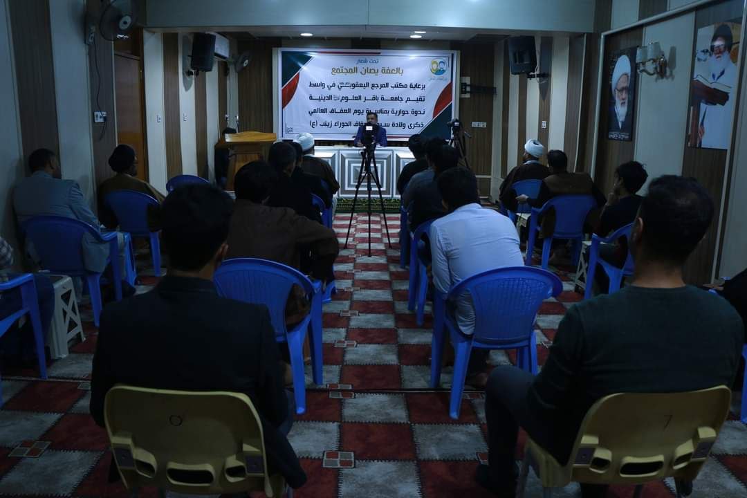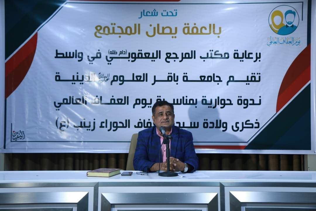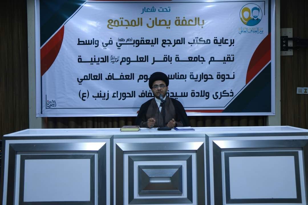 أقامت جامعة باقر العلوم (ع) الدينية ندوة حوارية تثقيفية بعنوان (بالعفة يصان المجتمع) بمناسبة يوم العفاف العالمي (ولادة زينب ع.برعاية مكتب سماحة المرجع الديني الشيخ محمد اليعقوبي في واسط وبحضور جمع من طلبة الحوزة الدينية وبعض المومنين.