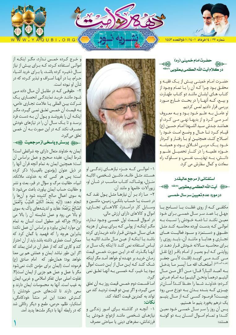وأضاف “تناول العدد الثاني و العشرون من النشرة في الصفحة الاولى کلمة لسماحة المرجع الدیني الیعقوبي في شخصیة السید الامام الخمینی (ره)، وایضا استفتاء من سماحته حول (من لم يتخذ رأس سنة خمسية)، و ایضا سؤال و جواب مستلّ من کتاب لسماحته بعنوان (الاسئلة والأجوبة)”.