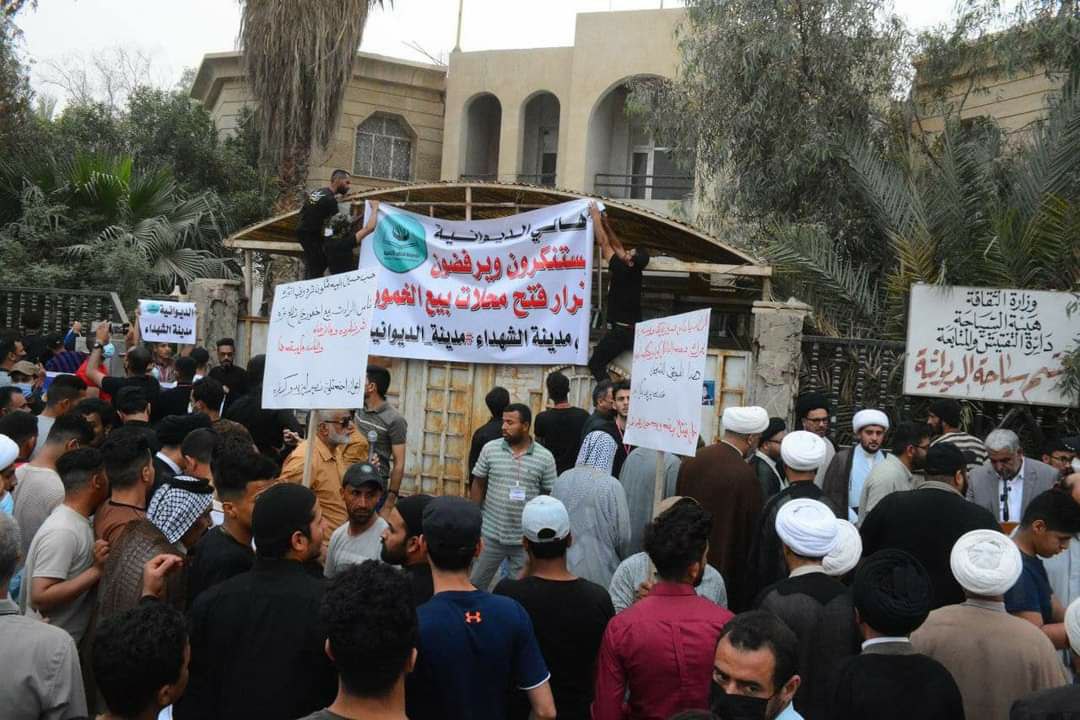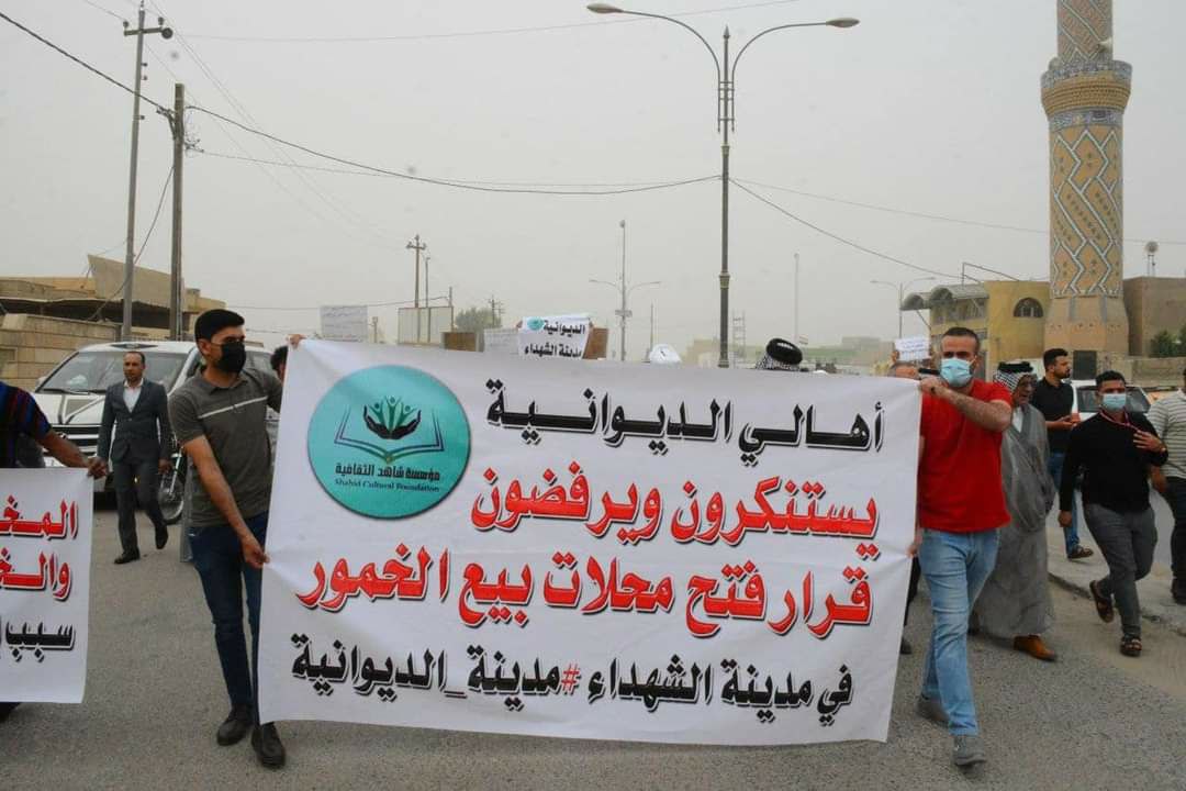 نحن أهالي الديوانية نستنكر ونرفض إعطاء دائرة السياحة والاثار والحكومة المحلية في المحافظة إجازة لبيع الخمور في مدينة الديوانية (مدينة الحسين الثانية) تلك المدينة التي تتصف بخدمة زوار الامام الحسين (عليه السلام).