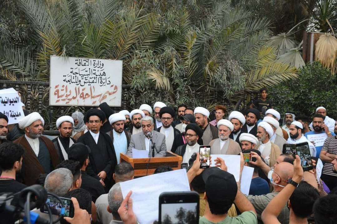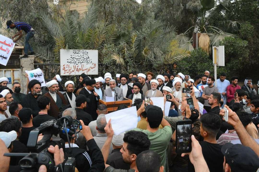 وطالب المتظاهرون الغاضبون من خلال القاء بيان من امام دائرة السياحة والاثار: