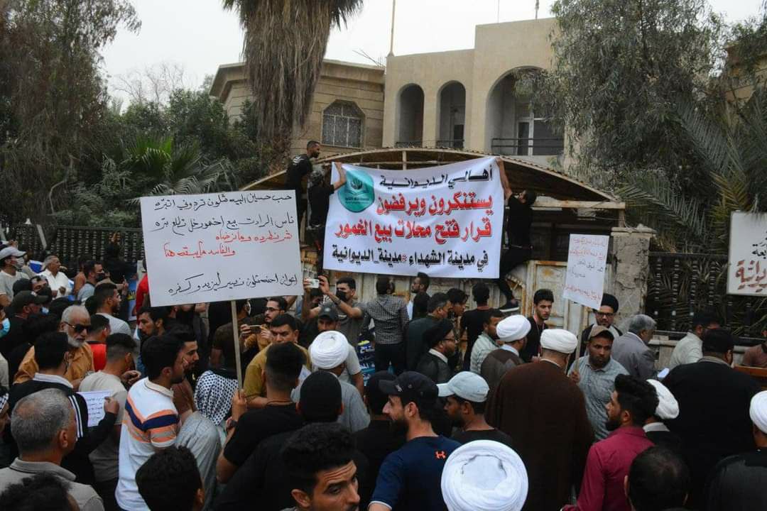 تظاهر أهالي الديوانية، اليوم الأربعاء، احتجاجا على افتتاح محل لبيع الخمور في مدينة الامـام الحسين (ع) الثانية ورفض ضد الدعوات العقائدية المنحرفة التي تدعوا لهدم المراقد الدينية وسط أجواء غاضبة.