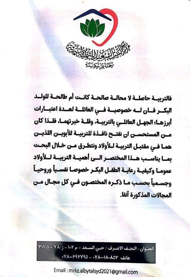 أصدر مركز البيت السعيد للتنمية الأسرية، كتيب (تربية الاولاد في المنظور الإسلامي).