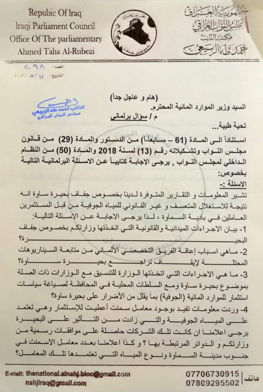 وبحسب وثيقة تلقتها “النعيم نيوز”. فإن “الأسئلة كانت حول أسباب جفاف بحيرة ساوة في محافظة المثنى”.