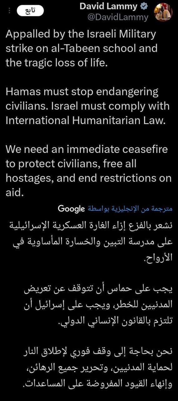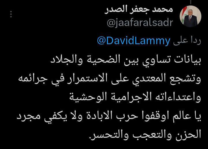 قال محمد جعفر الصدر، اليوم السبت، رداً على تغريدة وزير الخارجية البريطاني “ديفيد لامي”، إن البيانات تشجع المعتدي على الاستمرار بجرائمه. وفيما يلي التغريدات وتابعتها “خليك ويانة”.