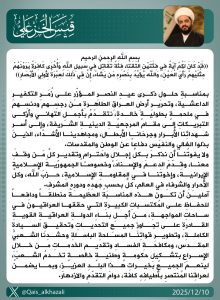 الشيخ الخزعلي يقدم التهاني لأسر الشهداء والجرحى والمقاتلين بذكرى النصر على داعش