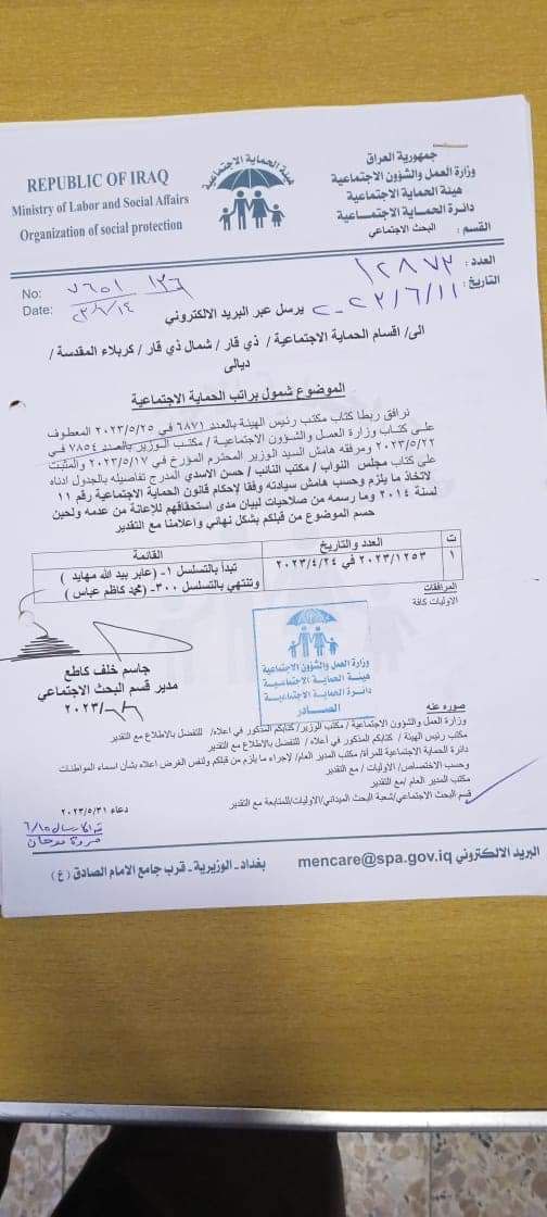 النائب الأسدي يستحصل الموافقة على شمول أعداد جديدة براتب الحماية الاجتماعية
