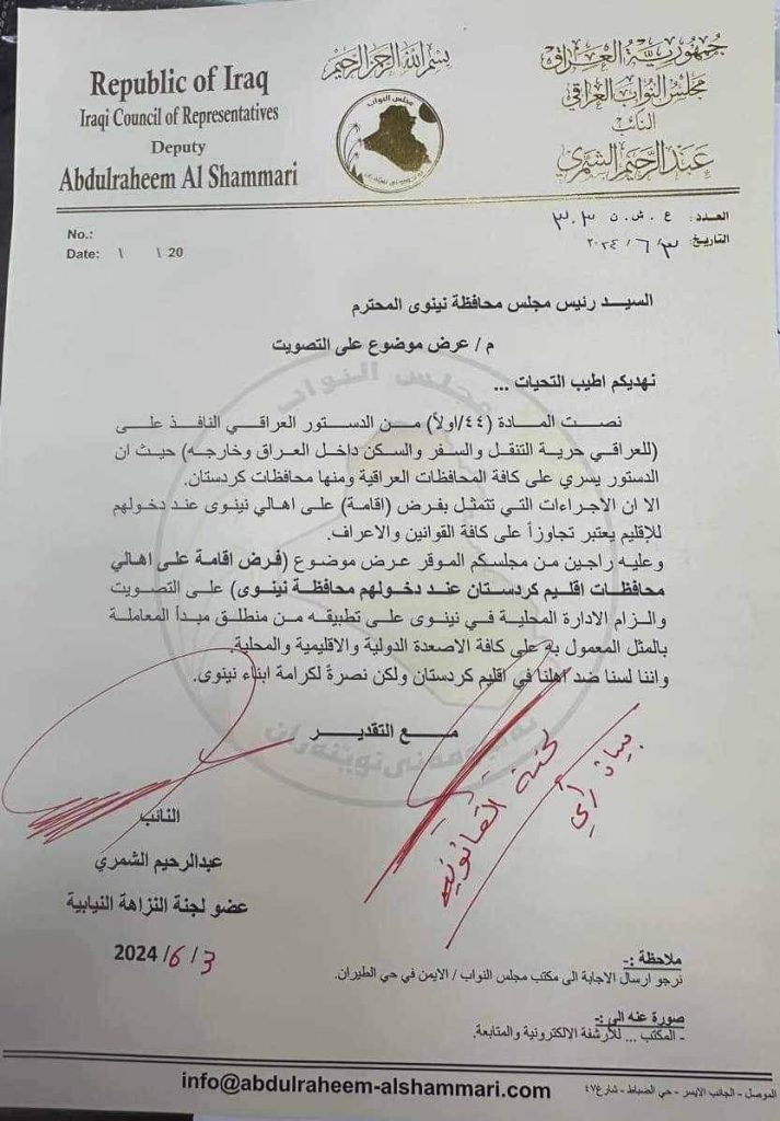 وذكر بيان لمكتب النائب، تلقت “خليك ويانة” نسخة منه، أن النائب عبدالرحيم الشمري يخاطب مجلس محافظة نينوى لغرض التصويت على قرار فرض الاقامة على اهالي محافظات الاقليم عند دخولهم لمحافظة نينوى وذلك عمًلا بمبدأ المعاملة بالمثل”.
