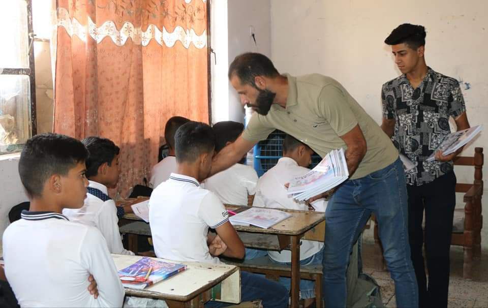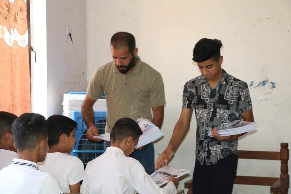 بالصور.. مركز شباب اليقين يوزع الكتب المدرسية مجاناً في مدرسة أبو الحسن الابتدائية