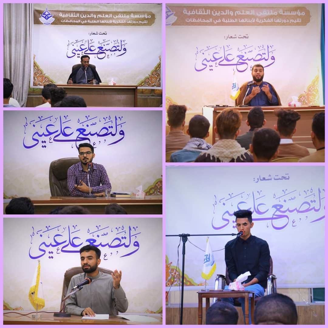 وبيّنت المؤسسة، أنه “حضر الدورة لإقامة الحلقات الإرشادية والحوارية مع الطلبة عدد من طلبة العلوم الدينية، منهم: (الشيخ حسنين الساري – الشيخ صادق العسكري – الشيخ مرتضى الحساني – الشيخ عبود الكعبي – السيد اكرم حبيب – الأستاذ كرار العتابي – الأستاذ فاضل الخفاجي – الشيخ حيدر الركابي – الأستاذ حسين صباح)”.
