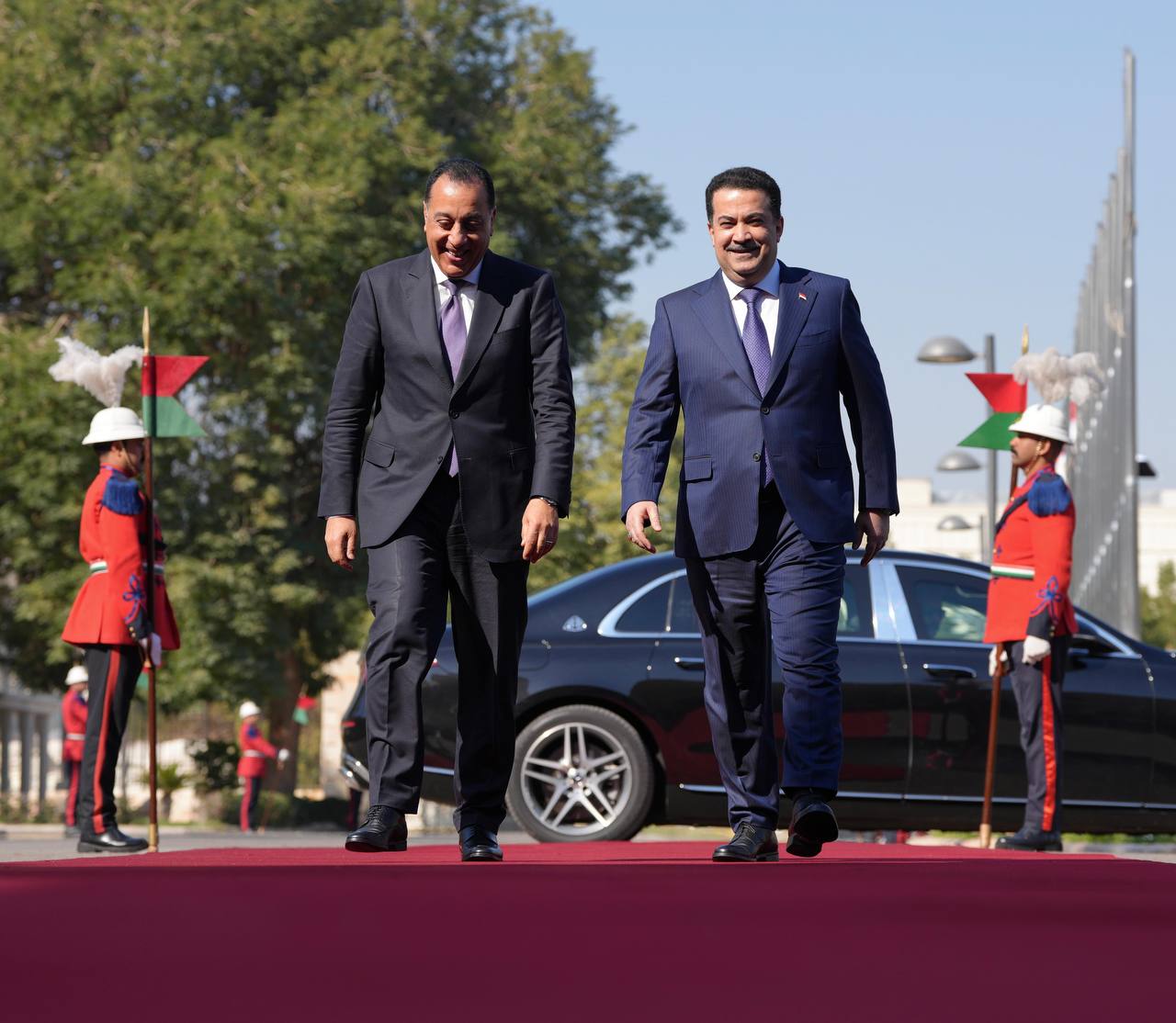 بدأت مراسيم الاستقبال الرسمي لرئيس الوزراء المصري، مصطفى مدبولي، من قبل رئيس الوزراء محمد شياع السوداني، بالقصر الحكومي في بغداد.