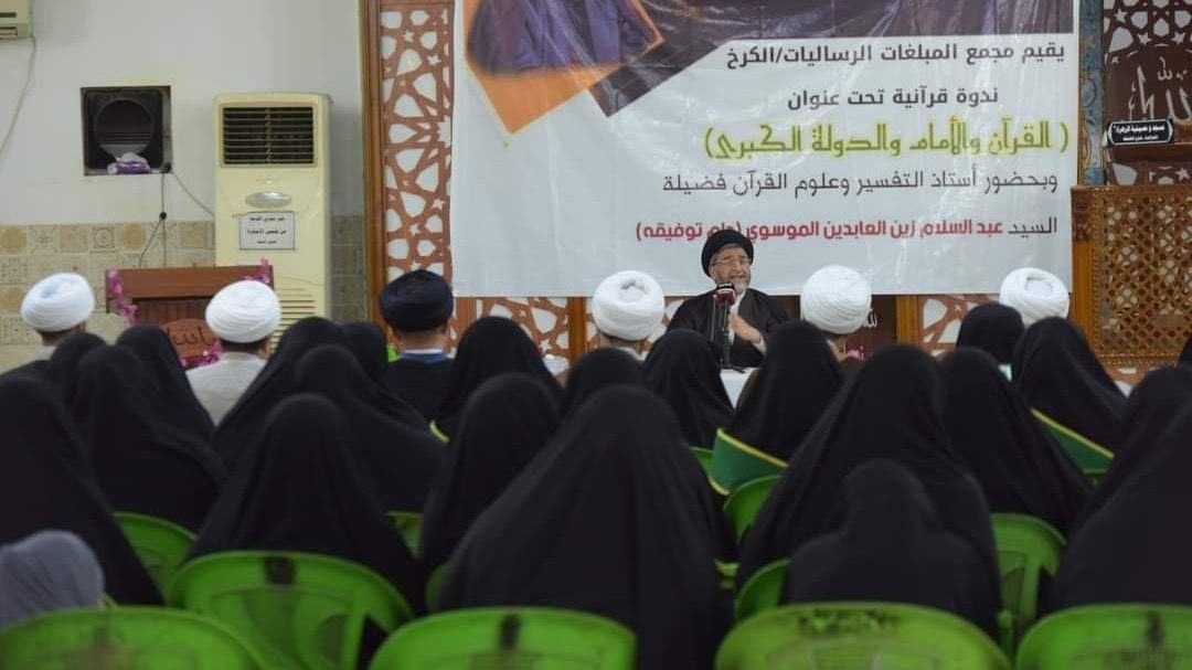 وذكر بيان لمجمع المبلغات، تلقت “النعيم نيوز” نسخة منه، أنه “برعاية مكتبُ سماحة المرجع الديني الشيخ محمد اليعقوبي في بغداد/الكرخ، وتزامناً مع ذكرى ولادة الإمام المهدي (عج)، أقام مجمع المبلغات الرساليات/فرع الكرخ، ندوة قرآنية تحت شعار (القرآن والإمام والدولة الكبرى)”.
