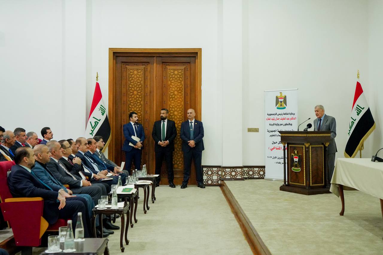 وتابع “وألقى وزير البيئة السيد نزار ئاميدي كلمة أشار فيها الى التأثير المتعاظم للتغيرات المناخية في العراق من زيادة الجفاف والتصحر والعواصف الترابية وتقليص الرقعات الزراعية وفقدان النظم الايكولوجية وتأثيراتها الاجتماعية والصحية والاقتصادية كزيادة الفقر والهجرة من المناطق المتأثرة والتهديد المباشر للأمن المائي والغذائي والمجتمعي، مؤكدا بهذا السياق أننا نواجه تهديدا خطيرا يهدد الأجيال القادمة”.
