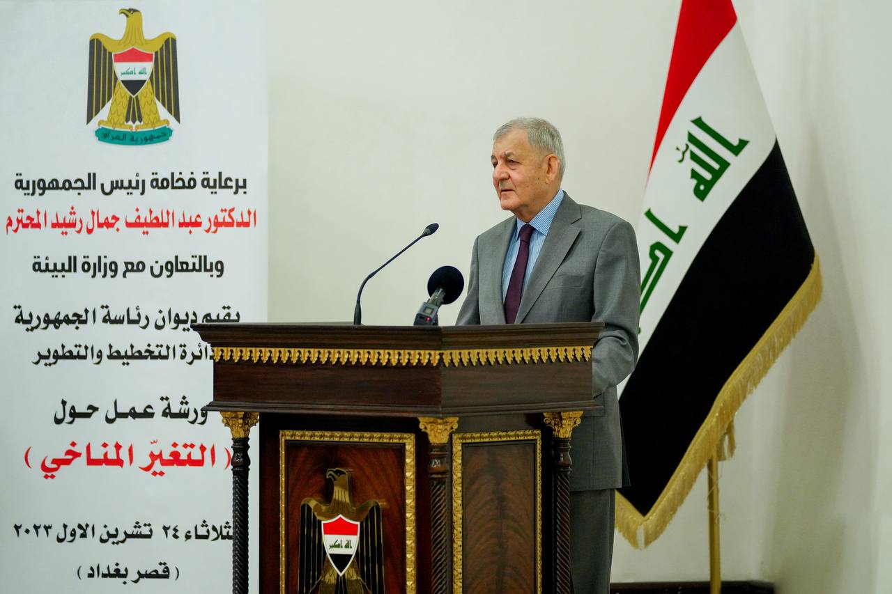 وأضاف أن “التغير المناخي الذي يواجه العالم ككل والعراق خاصة من شأنه أن يقوض ما حققته عقود من التقدم في مجال الصحة سيما وأن العراق من أكثر الدول عرضة للمخاطر الناتجة عن هذا التدهور البيئي الحاد والمتمثل بتعرضه الى موجات الحر وعدم انتظام هطول الأمطار، فضلا عن الجفاف وشحة المياه وما ينتج عنها من انحسار نسبة المساحات الخضراء وزيادة ملوحة الأراضي وانعكاس ذلك سلبا على الحالة الاقتصادية للبلد وأمنه الغذائي، مشيرا إلى حرص رئيس الجمهورية على الاهتمام بالملفات ذات العلاقة المباشرة بحياة المواطن وفق أولوياتها المتمثلة بالأمن والاستقرار والمياه والمناخ. بعدها بدأت فعاليات الورشة بإدارة المدير العام لدائرة التخطيط والتطوير في رئاسة الجمهورية السيد سكفان جندي وتضمنت مناقشة بحوث لعدد من المختصين تتعلق بالتغيرات المناخية وآثارها على العراق، والتنبؤات المناخية في العراق، كذلك المساهمات المحددة وطنيا للعراق وتوجهات العمل المناخي، إضافة إلى استعدادات العراق لمؤتمر الأطراف القادم في الإمارات العربية المتحدة”.