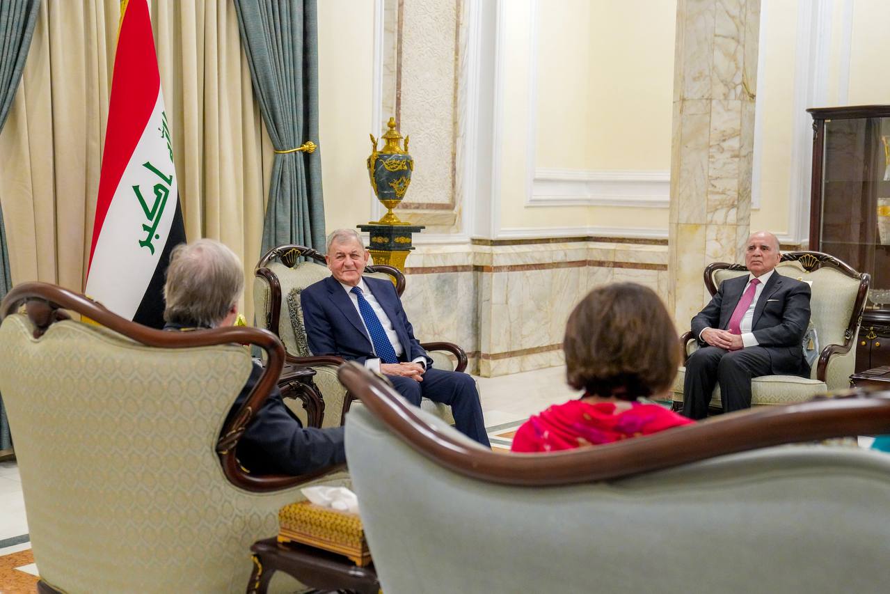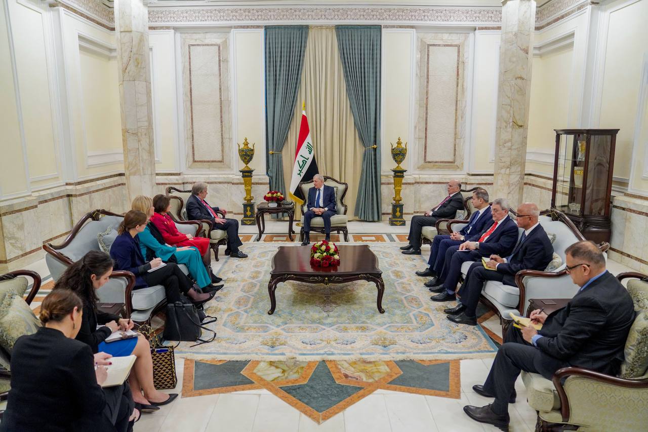 وأضافت “وبحث الرئيس والأمين العام، خلال اللقاء، الجهود المتحققة لترسيخ الأمن والاستقرار في البلاد، وآليات عمل بعثة الأمم المتحدة في العراق، والدور الذي تضطلع به إلى جنب الجهود الوطنية ودور المنظمات والدول الصديقة في دعم النازحين والمهجرين، حيث أكّد رئيس الجمهورية تطلّع العراق إلى دعم المجتمع الدولي والتعاون والعمل المشترك للاستجابة إلى الاحتياجات الإنسانية للعوائل النازحة”.