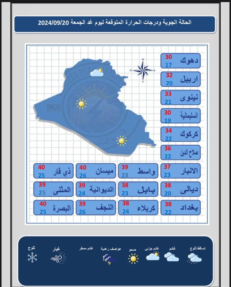 وذكر بيان للهيئة، تلقت “خليك ويانا” نسخة منه، أن “غداً الجمعة سيكون الطقس صحواً مع بعض الغيوم في المنطقتين الوسطى والجنوبية ، بينما سيكون الطقس غائماً جزئياً مع تساقط زخات مطر رعدية في المنطقة الشمالية ، ودرجات الحرارة ستكون مقاربة لليوم السابق في جميع مناطق البلاد”.