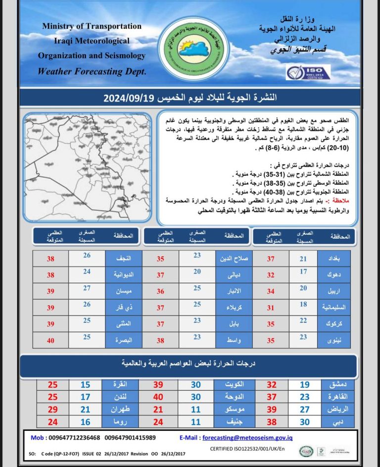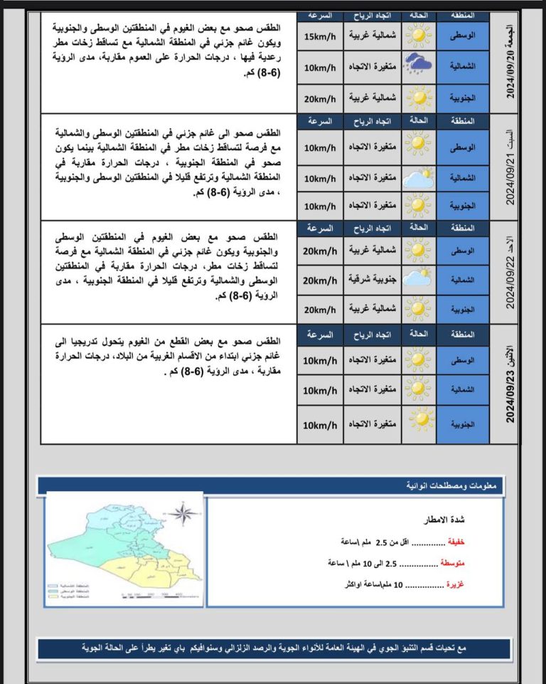أعلنت هيئة الأنواء الجوية، اليوم الخميس، عن تفاصيل حالة الطقس في العراق للأيام المقبلة، وتوقعت تساقطاً للأمطار وارتفاعاً في درجات الحرارة.