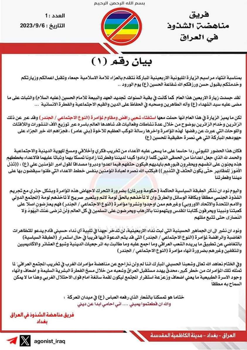 أكد فريق مناهضة الشذوذ في العراق ،اليوم السبت، أن مايميز الزيارة الأربعينية هذا العام أنها حملت معها استفتاء شعبي رافض ومقاوم لمؤامرة الجندر.