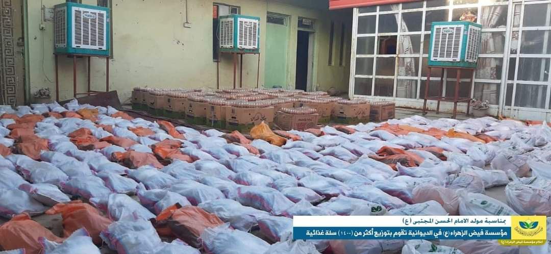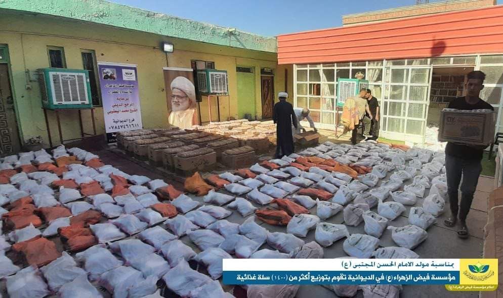 وذكر بيان للمؤسسة، تلقت “النعيم نيوز” نسخة منه، أنه “برعاية مكتب سماحة المرجع الديني الشيخ محمد اليعقوبي في الديوانية. قامت مؤسسة فيض الزهراء (ع) بتوزيع أكثر من (1400) سلة غذائية على العوائل المتعففة. بمناسبة ذكرى ولادة كريم أهل البيت (ع) الإمام الحسن المجتبى (ع)، في مركز محافظة الديوانية والأقضية والنواحي”.