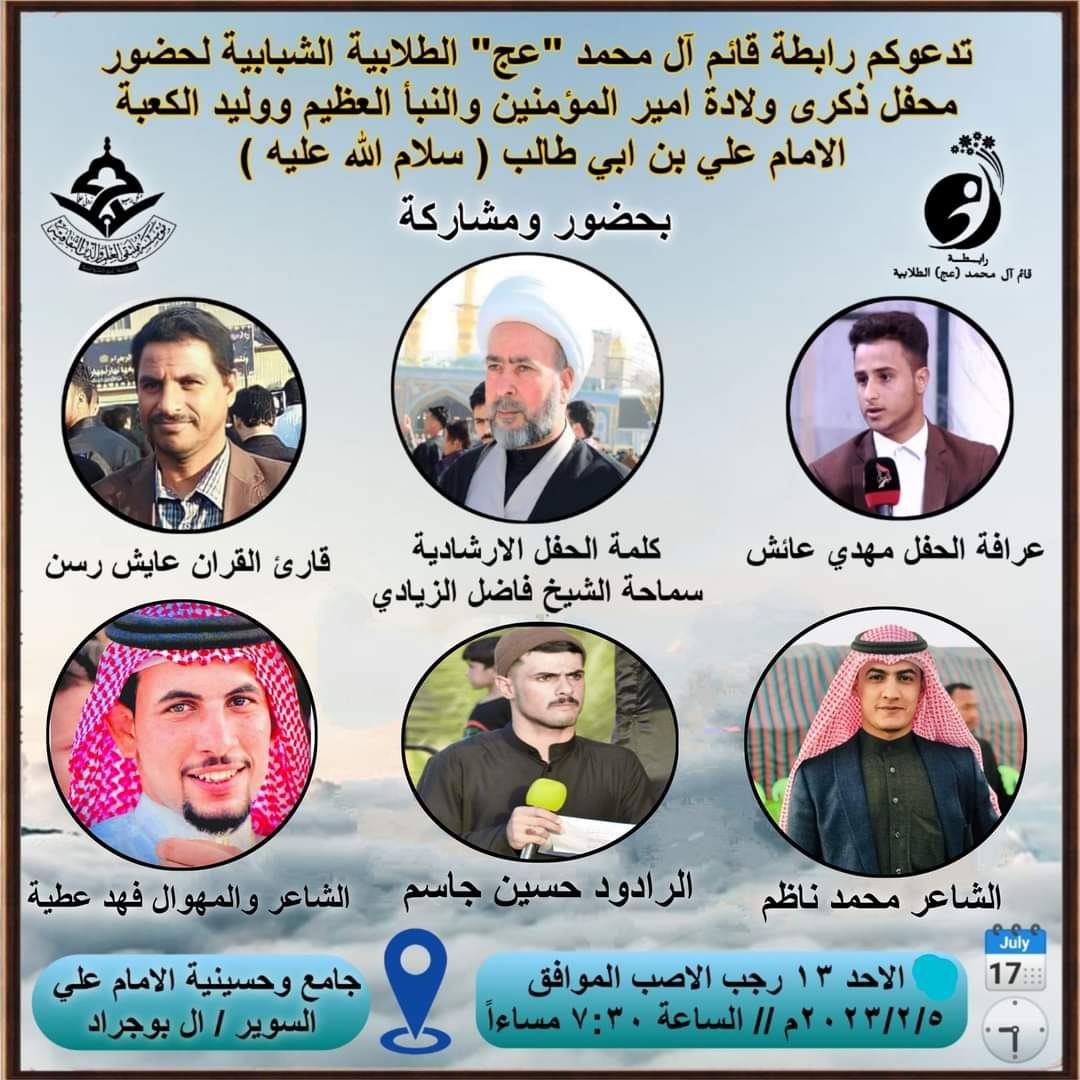 أعلنت رابطة قائم آل محمد (عج) الطلابية الشبابية/إحدى تشكيلات مؤسسة ملتقى العلم والدين الثقافية فرع المثنى، اليوم الثلاثاء، عن إقامة محفلها السنوي بمناسبة ذكرى ولادة مولانا أمير المؤمنين الإمام علي بن أبي طالب (ع).
