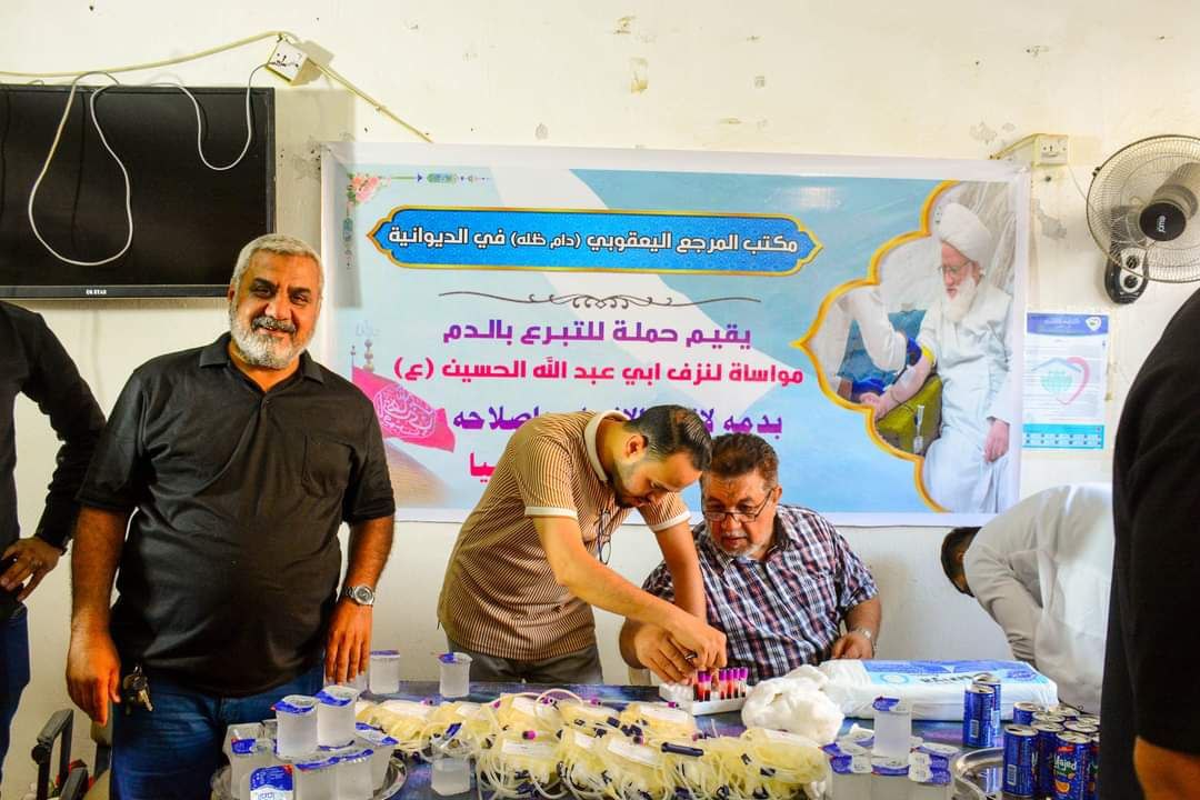 قام مكتب سماحة المرجع الديني الشيخ محمد اليعقوبي في الديوانية حملة للتبرع مواساة لنزف ابي عبد الله الحسين (ع) بدمه لإنقاذ الإنسان وإصلاحه ودعما لمرضى الثلاسيميا وذلك لتبيان الجانب الانساني للقضية الحسينية، مشاركة عدد من فضلاء المكتب الشريف واساتذة أكاديميين وعدد من أبناء الخط الرسالي.