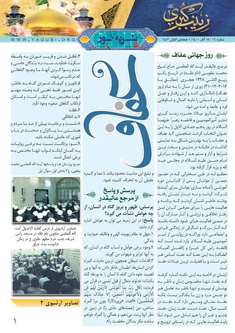 وأضافت، أن “العدد السادس عشر من النشرة، تناول في الصفحة الأولى خبر عن توجیه سماحة المرجع الديني الشيخ محمد اليعقوبي (دام ظله) بتخصيص يوم سنوي باسم (يوم العفاف)، لما يحظى به هذا السلوك الإنساني والسماوي النبيل من أهمية في صلاح الأمة وازدهارها وهو یوم ولادة السيدة زينب (ع)”.