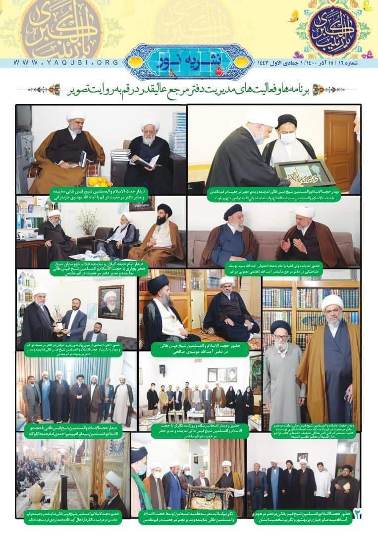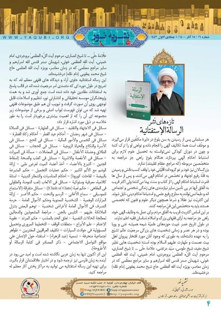 وأشارت، إلى أن “الصفحة الرابعة من النشرة، تناولت تقریراً حول إصدار جدید لمؤسسة نور للتحقیق والنشر تحت عنوان (الرسالة الاستفتائیة) لسماحة المرجع الدیني الشيخ محمد اليعقوبي (دام ظله)، قام بإعدادها الشیخ قیس الطائي“.
