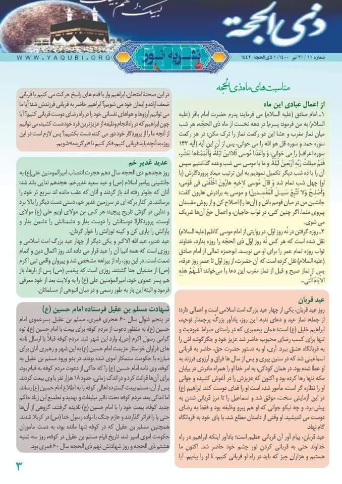 واحتوت النشرة بعض من نشاطات مکتب سماحة المرجع الیعقوبي في قم المقدسة في الصفحة الثانیة؛ وفي الصفحة الثالثة أشیر الی أهم اعمال و مناسبات شهر ذي الحجة منها صلاة العشري الأولی من هذا الشهر، والأعیاد المبارکة الأضحی وغدیر خم، و ایضا شهادة مسلم بن عقیل علیه السلام.
