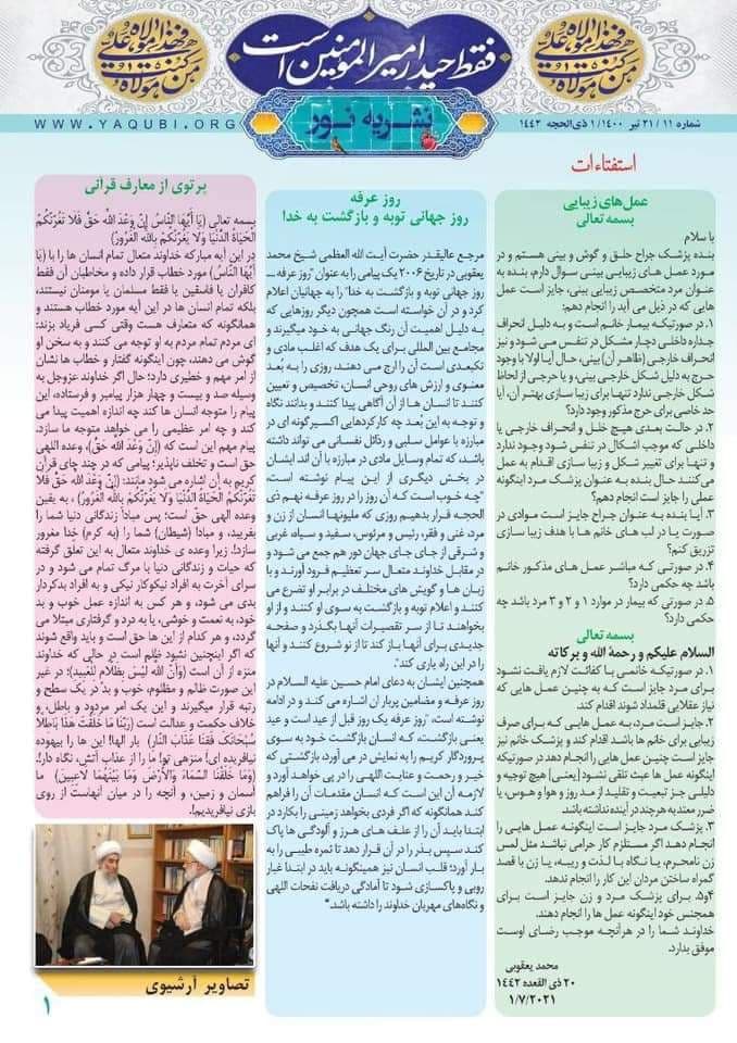 وتناول العدد الحادي عشر من النشرة قبسات من القرآن الکریم من سماحة المرجع الدینی الشیخ الیعقوبی تحت عنوان (يَا أَيُّهَا النَّاسُ إِنَّ وَعْدَ اللَّهِ حَقٌّ فَلَا تَغُرَّنَّكُمُ الْحَيَاةُ الدُّنْيَا وَلَا يَغُرَّنَّكُمْ بِاللَّهِ الْغَرُورُ) واستفتاء حول عمليات التجميل وبیان سماحة المرجع حول یوم عرفة بعنوان یوم التوبة العالمی فی الصفحة الاولی.