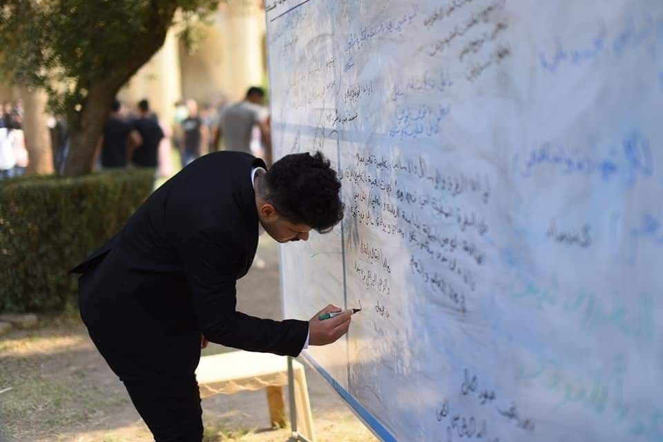 وأضاف، أن “معرضُ الرسمِ حمل عنوانَ (الزمن القبيح) وشهدَ حضوراً كبيراً مع الاستماع لأسئلتهم والإجابة عنها بتوفيق الله تعالىٰ، ولاقىٰ الجدارُ الحر حشوداً مرحِّبة ومتفاعلة مع سؤالِهِ الذي كان عنوانه [الدراسةُ الأكاديميّة.. آلامٌ وآمال، ما تعليقُك!]”.