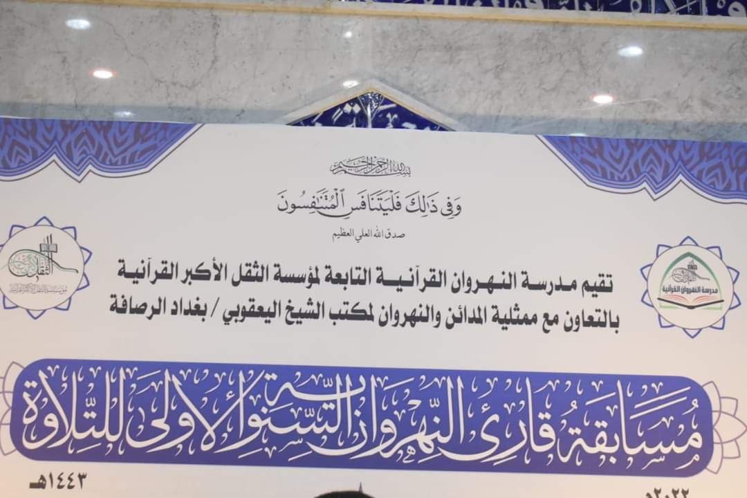 اقامت ممثلية سماحة المرجع الديني الشيخ محمد اليعقوبي في المدائن والنهروان بالتعاون مع مدرسة النهروان القرآنية التابعة لمدرسة الثقل الأكبر القرآنيه المسابقة السنوية الأولى لقارئ القرآن الكريم لأختيار افضل قارئ للقرآن الكريم.