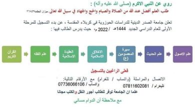 أعلنت جامعة الصدر الدينية في محافظة كربلاء المقدسة عن فتح باب التقديم للدراسة الحوزوية المسائية للعام الدراسي 1444-1445. وقال…